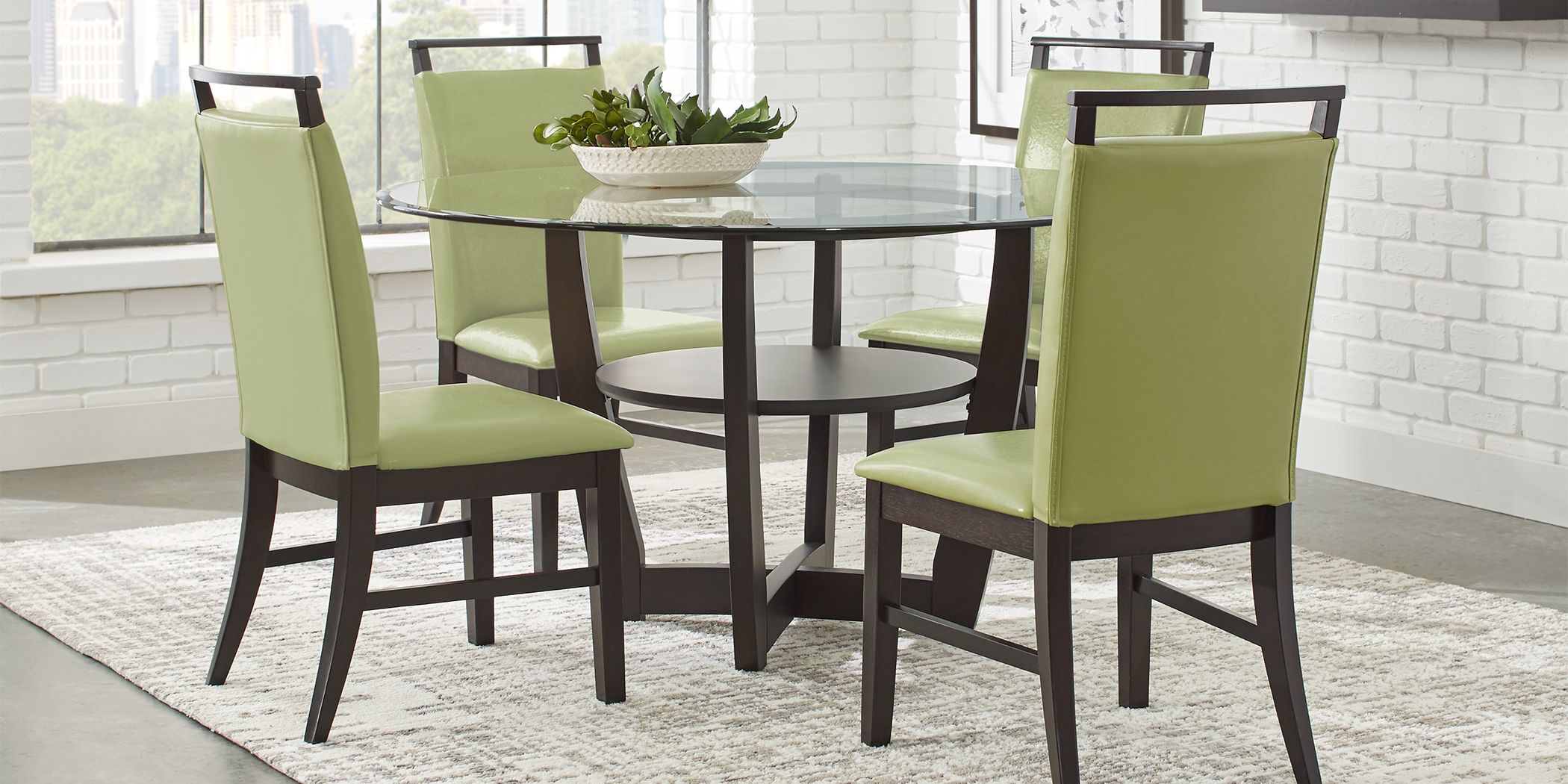 Roundhill furniture cylina glass top round dining table with 4 chairs. Dark gray metal and brown wood grain make these chairs an industrial, coastal farmhouse accent around your dining table. Complete dining room sets from rooms to go. Add to compare 0 /4. These pieces may feature wood or metal frames and a circular, square or rectangular surface. For a sleek, modern appearance, try a glass top dining room set with a clear pane resting on a metal base. Live edge walnut rectangular dining room set. By dorel living (6) $ 349 99. It's crafted of sturdy, durable wood and boasts a. Coco 8 piece dining set with server. Hollywood swank caviar and pearl glass top dining room set. Montibello black marble 40'' round 5 piece counter set. Clear, tempered glass with a beveled edge offers room at the table for four.
